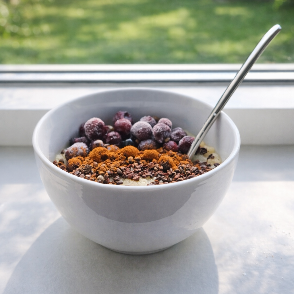 Deze warme bloemkoolpap met blauwe bessen en cacao is een verrassend lekker en voedzaam ontbijt. Het lijkt op een zoet ontbijtje, maar zit vol ingrediënten die je lichaam energie geven zonder een suikerdip. Door bloemkoolrijst te gebruiken ontstaat er een romige pap die licht verteerbaar is en rijk aan vezels.